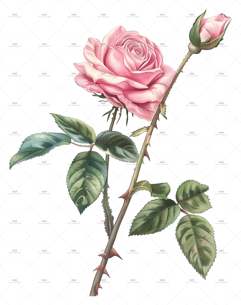 带绿叶的美丽粉玫瑰PNG免抠图