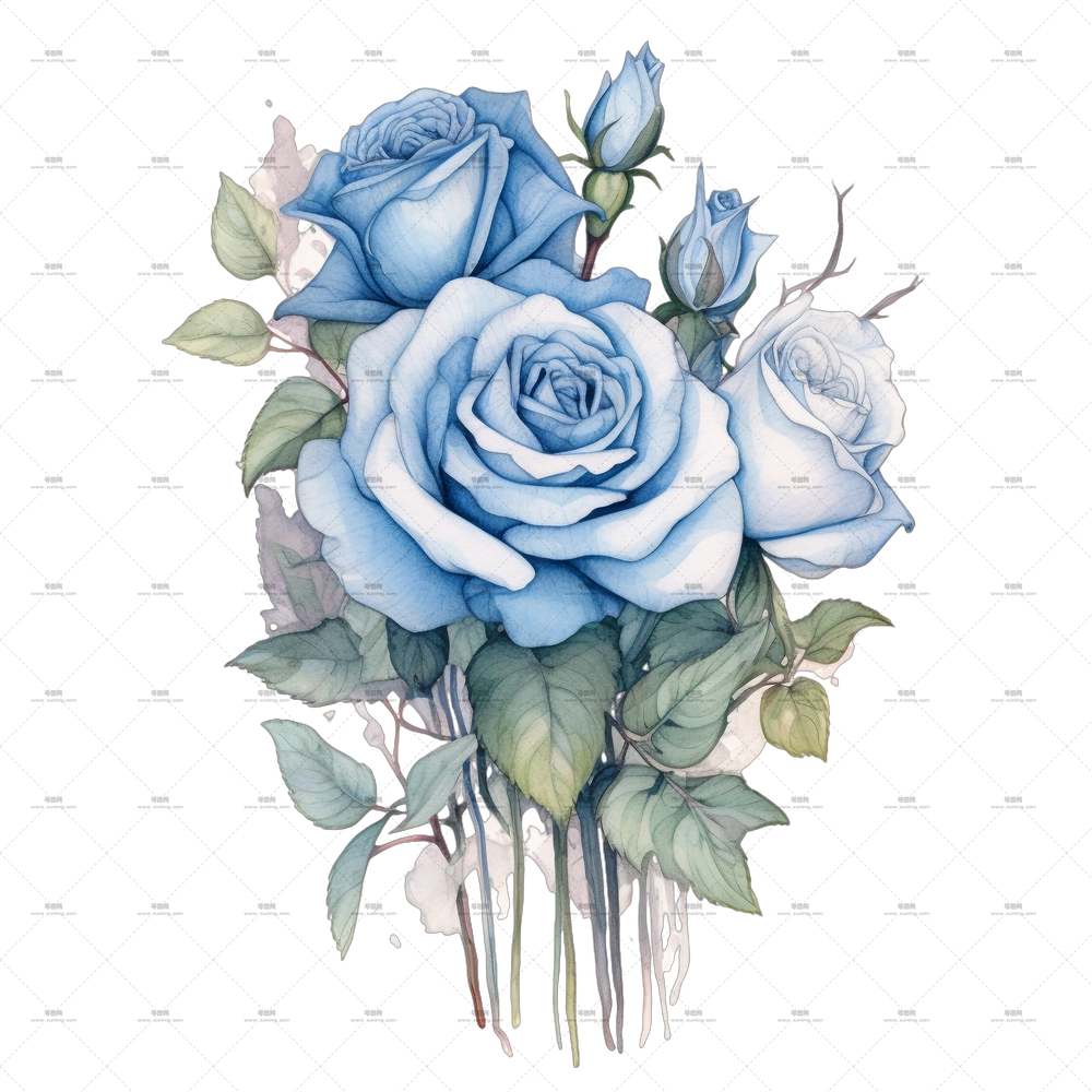 柔和水彩蓝玫瑰花束PNG免抠图预览图