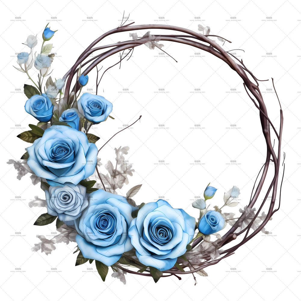 带蓝玫瑰的花卉花环PNG免抠图预览图