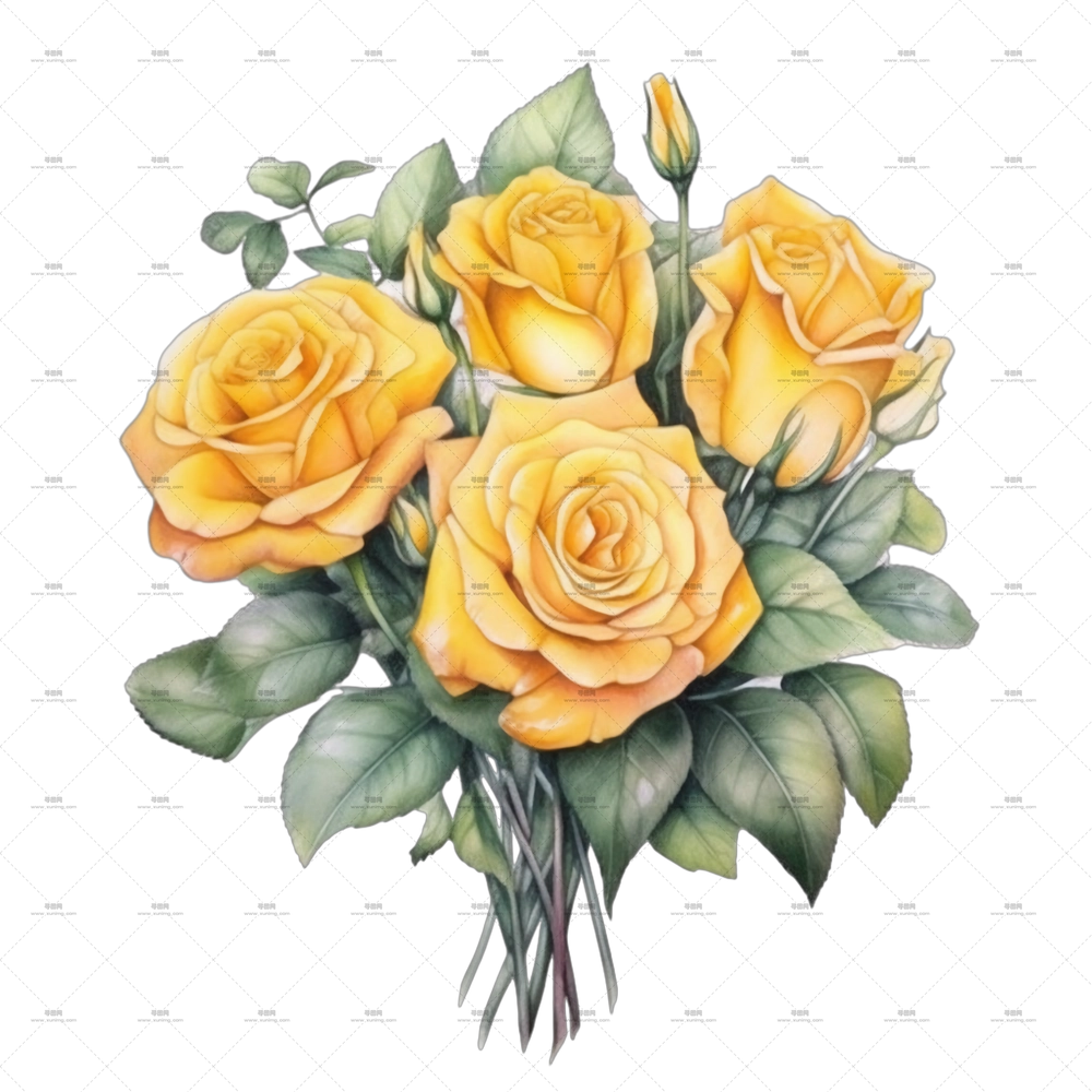 自然设计中带叶子的黄露珠玫瑰PNG免抠图
