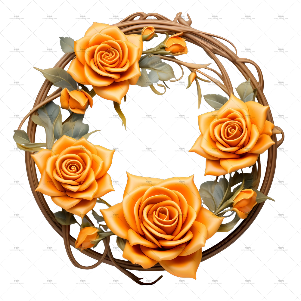 带叶子和藤蔓的黄玫瑰花环PNG免抠图预览图