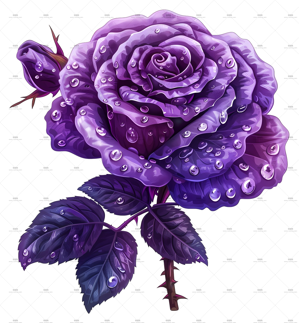 带茎和花蕾的紫玫瑰,装饰着水滴PNG免抠图预览图