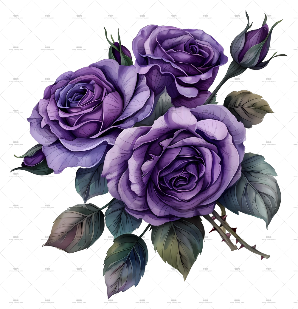带叶子的紫玫瑰插画PNG免抠图预览图