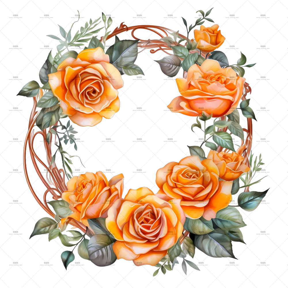 美丽橙玫瑰花环水彩插画PNG免抠图预览图