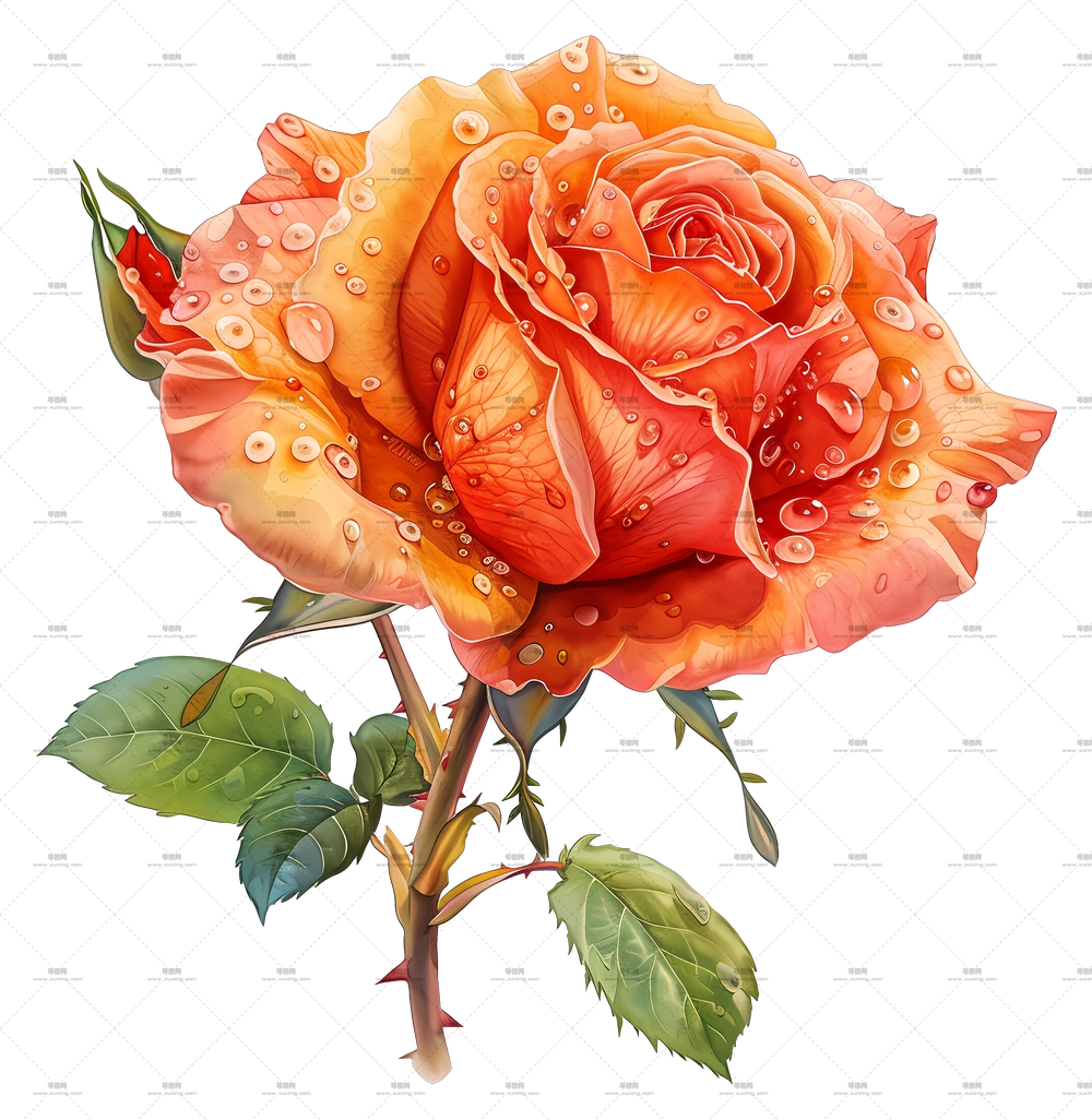水彩粉色玫瑰花和茎艺术品PNG免抠图