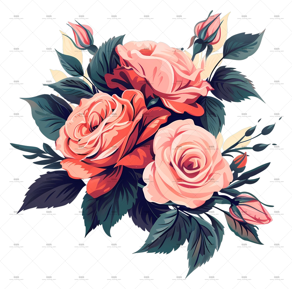 花卉花束设计中的玫瑰插画PNG免抠图预览图