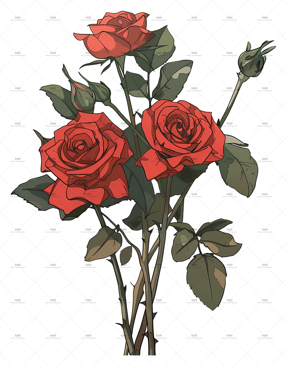 带茎的紫玫瑰插画PNG免抠图