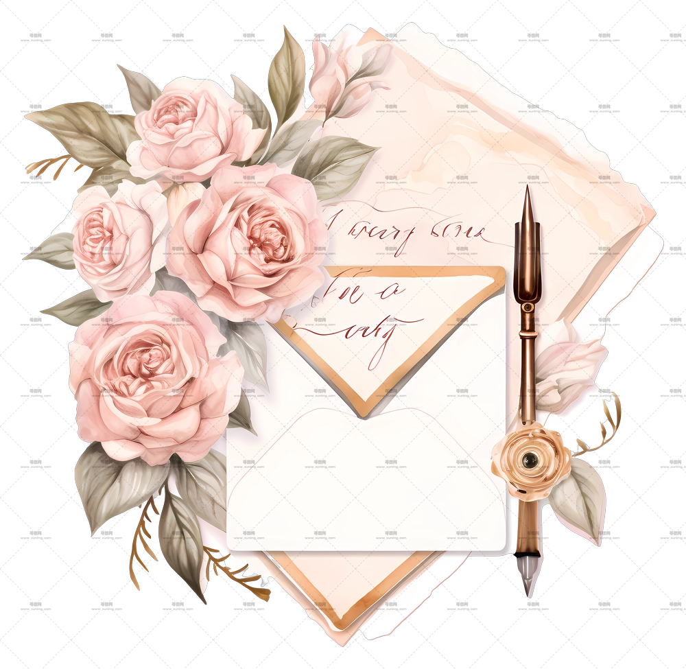 带玫瑰和笔的复古信封PNG免抠图预览图