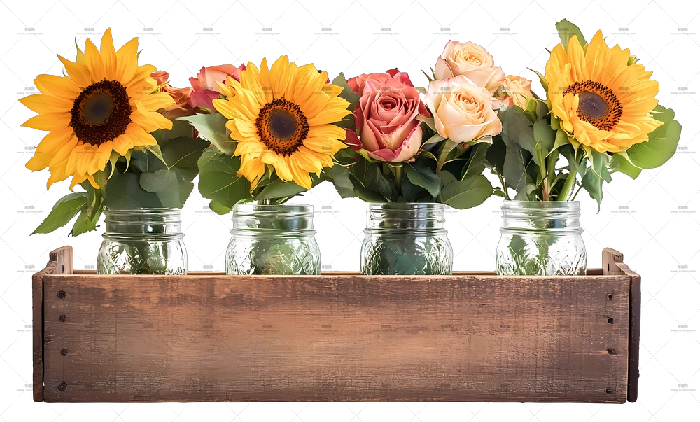 乡村盒子中的向日葵和玫瑰花束PNG免抠图预览图
