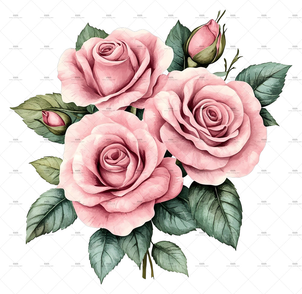 优雅红色玫瑰花和花茎绿叶PNG免抠图
