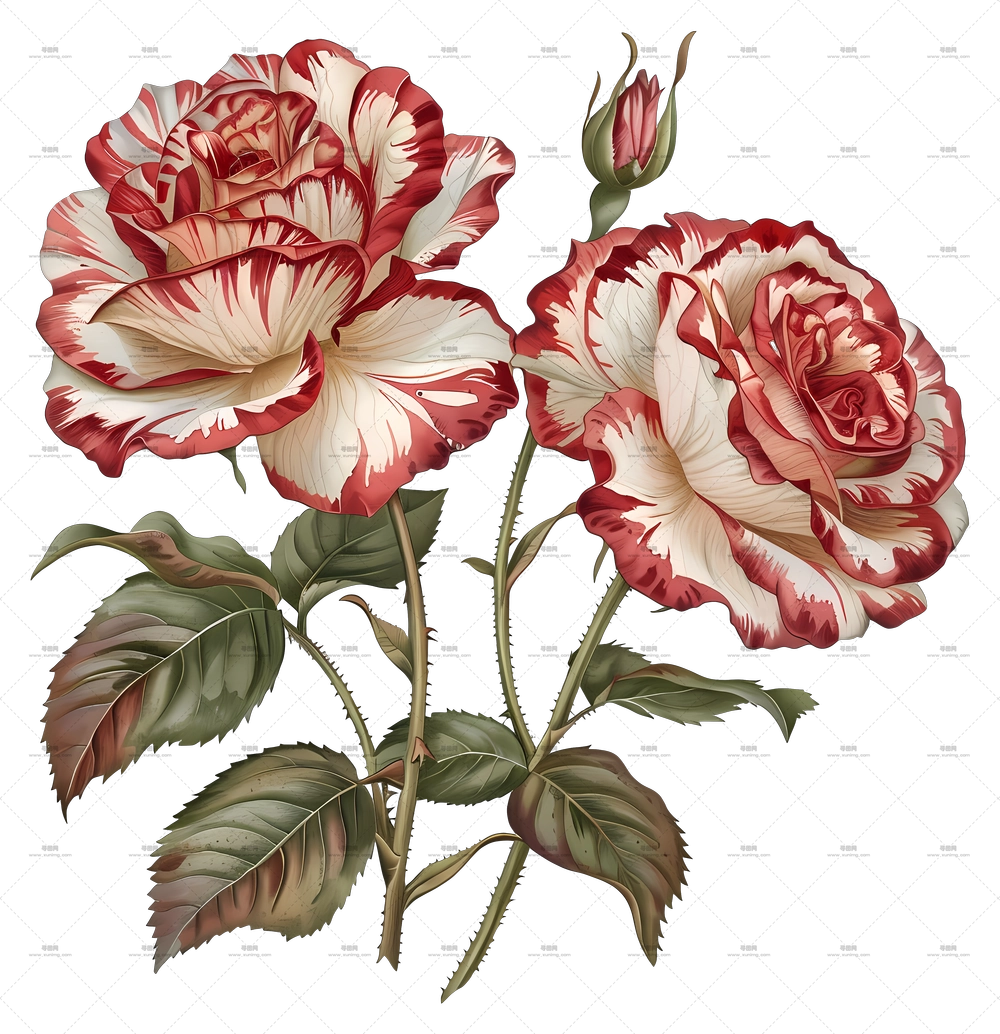 优雅红色玫瑰花和花茎和花蕾PNG免抠图