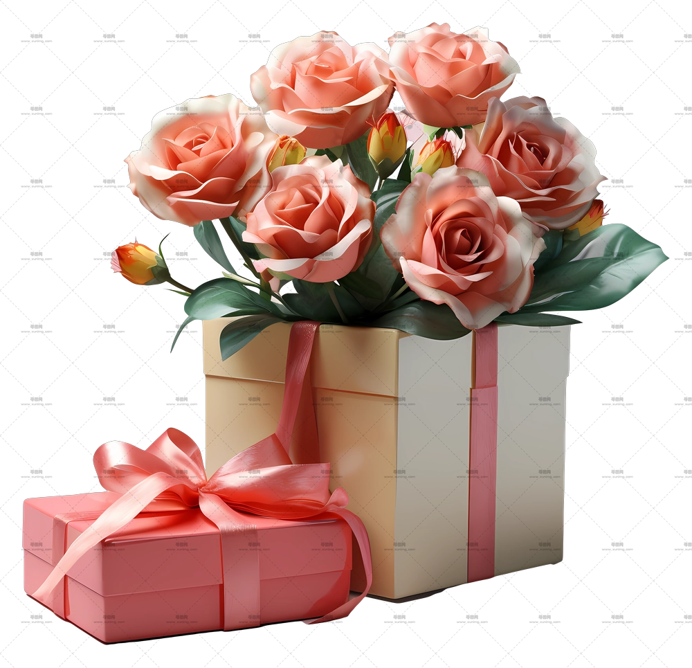 带紫玫瑰装饰的礼品盒PNG免抠图