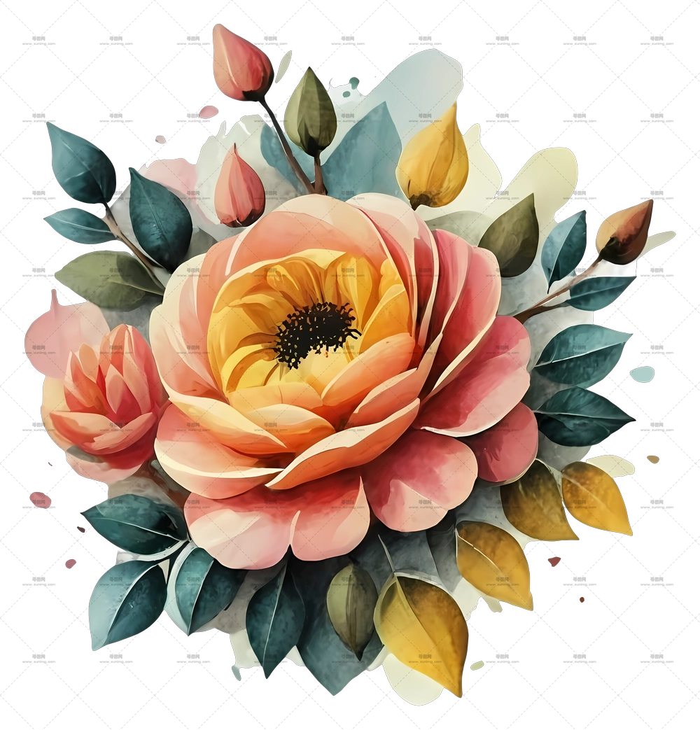 带玫瑰和叶子的水彩花卉花束PNG免抠图预览图