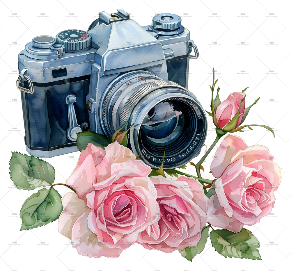 带粉玫瑰的复古相机插画PNG免抠图预览图