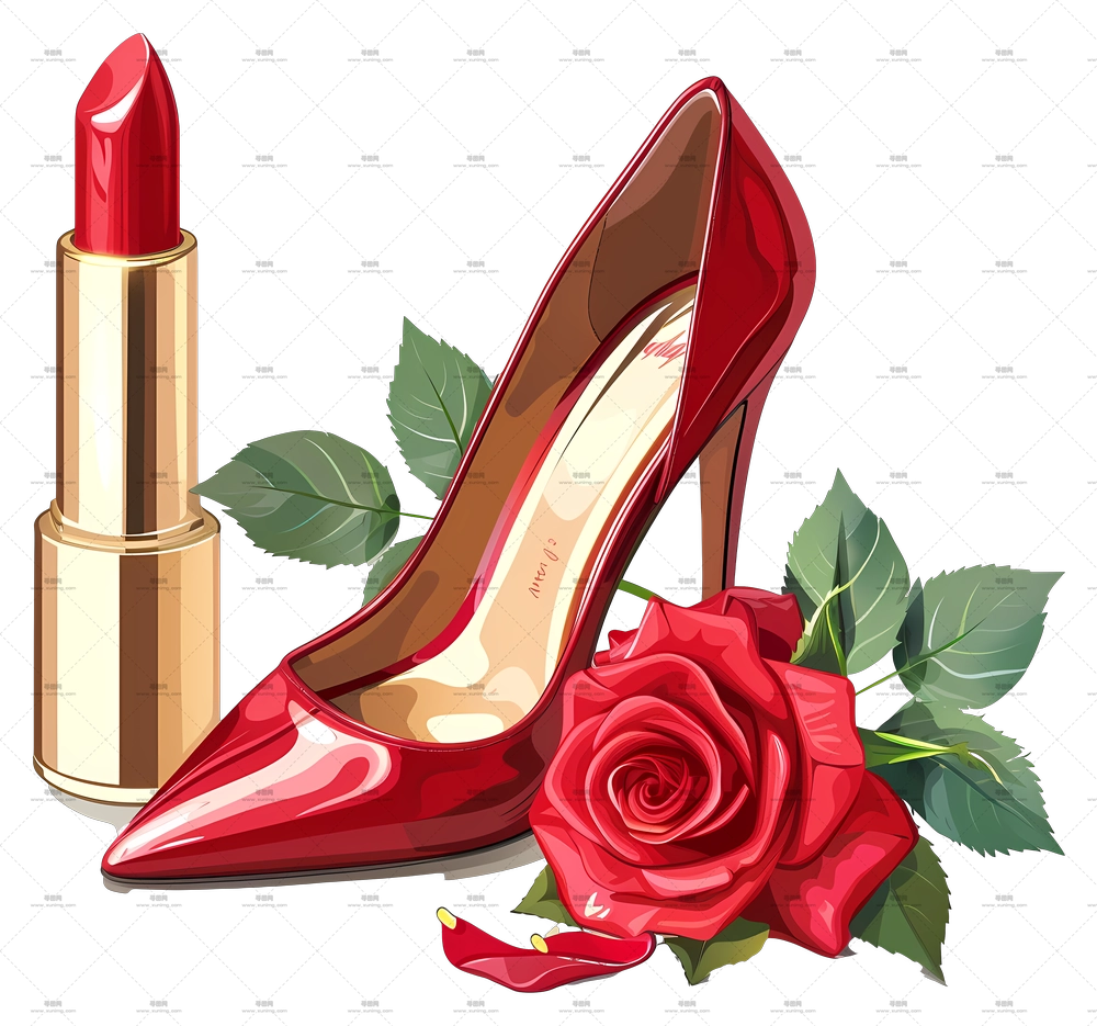 红高跟鞋、口红和玫瑰插画PNG免抠图预览图