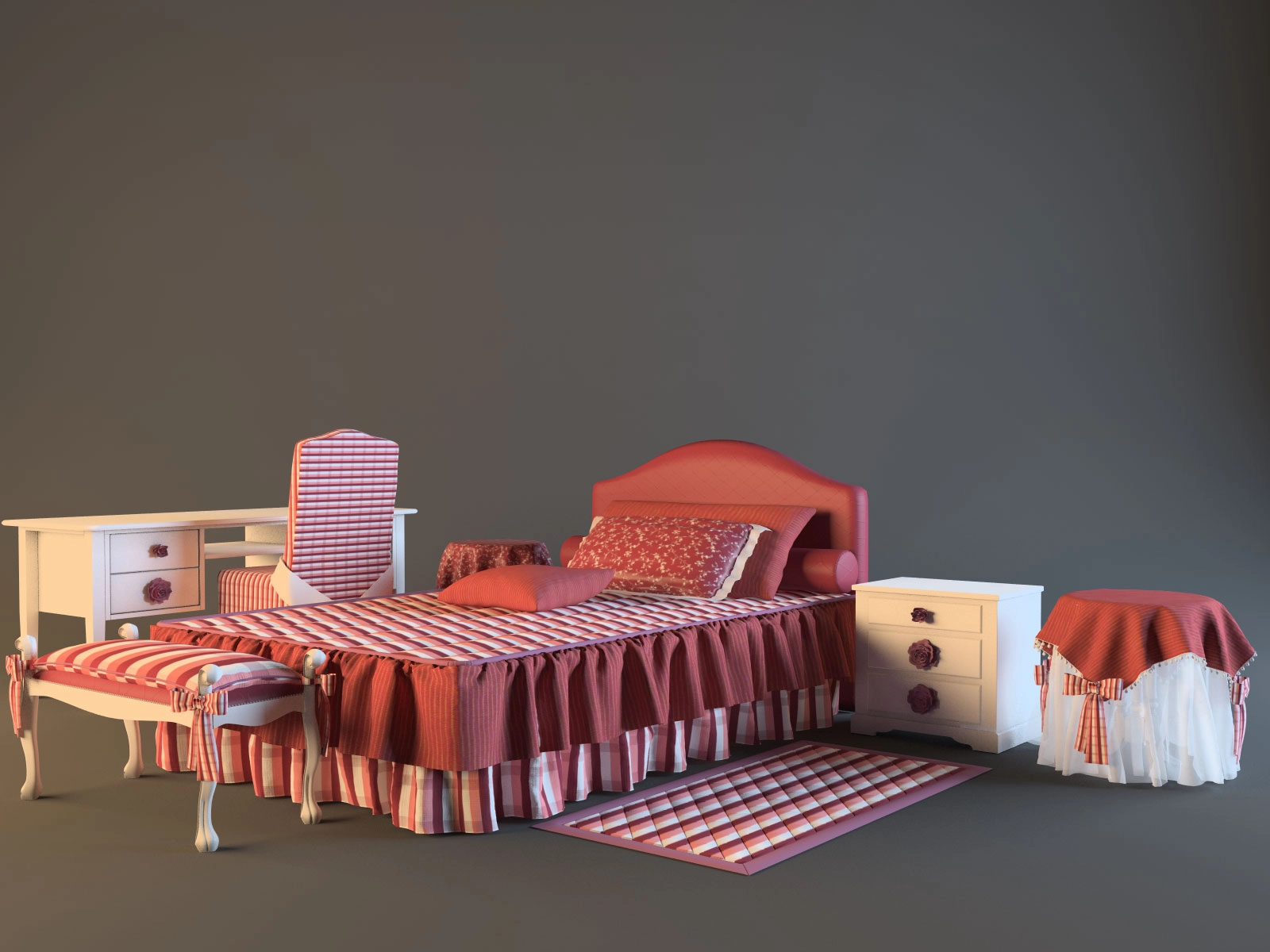 实木双人床床头柜换鞋凳和床头台灯组合3D模型