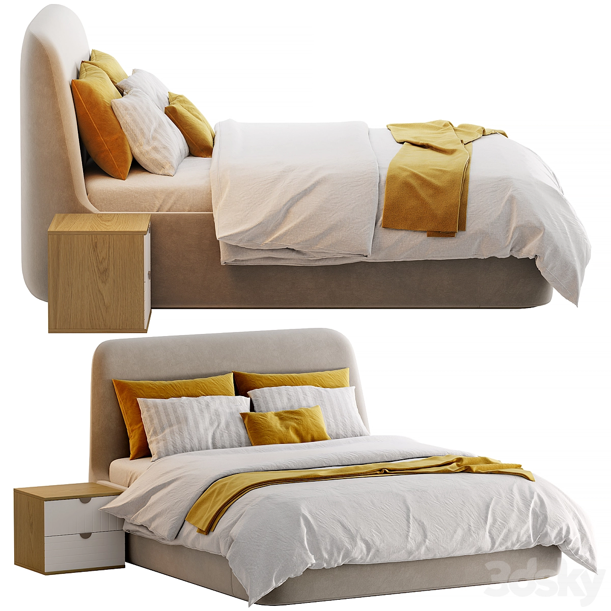 欧式双人床亚麻布床垫枕头床头柜和台灯组合3D模型